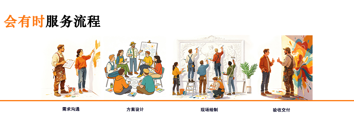 拥有资深壁画设计师团队,深入理解客户的空间风格、文化内涵与使用需求,提供多套原创方案及高清效果图预览,支持反复修改至满意为止。并且从现场考察、方案设计、绘制施工到售后维护,全流程无缝衔接,制定工期表、每日施工日志、阶段性验收节点,并通过微信群或在线文档实时同步进度,客户可随时抽查。